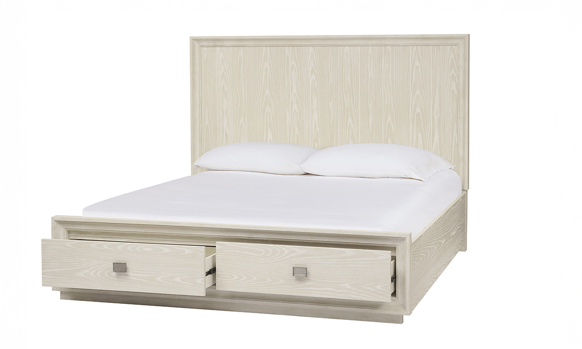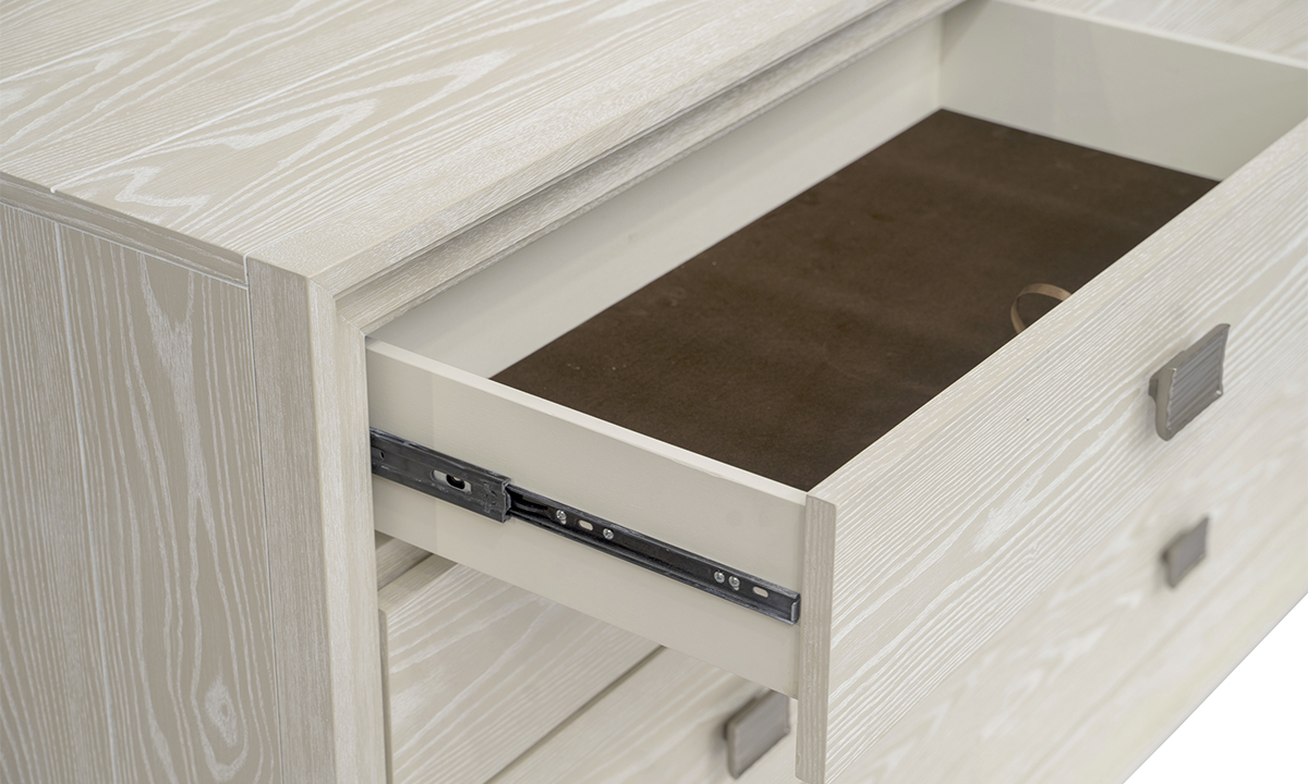Proprietary Sugar finish consists of a beige base and a soft white powder glaze that accentuates the wood's active grain with a low-sheen lacquer top coat