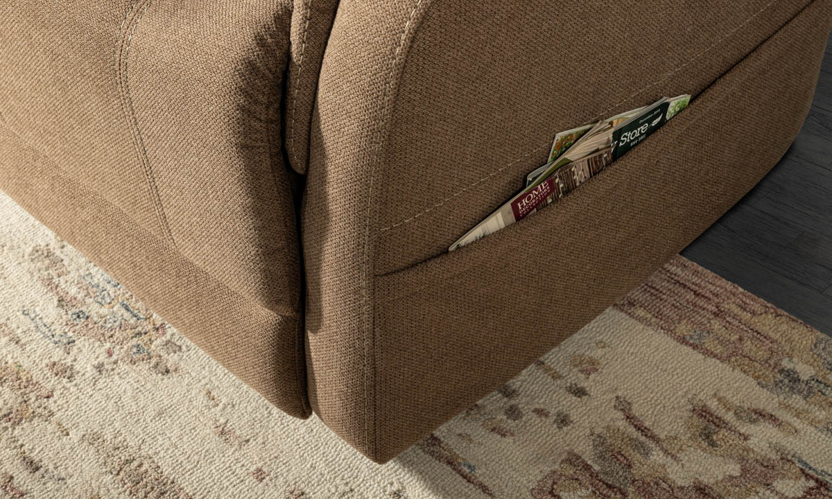 Sleek yet comfortable with narrow arm padding, the Helm Latte is loaded with conveniences such as side pockets for storing magazines and devices, handwand for USB charging and dual motors for independent control of the footrest and back of chair.