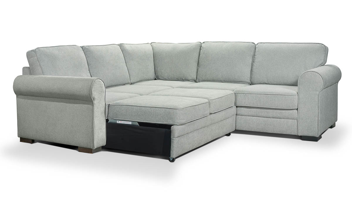 No matter what time of day or night, the Prospect Pebble 2-Piece Left Corner Sleeper Sectional will provide the comfort you crave. Resiliently crafted, this two-piece sectional starts with a solid Hardwood frame and heavy-duty webbing and sinuous spring support systems wrapped in high-density foam padding. Soft pebble Gray upholstery covers every inch of its welted roll arms and supportive plush cushions, creating a cozy place to curl up. A hidden handle on the loveseat helps this sectional transition into a sleeper with approximately 99” x 65” of space, perfect for a quick nap or impromptu overnight guests.