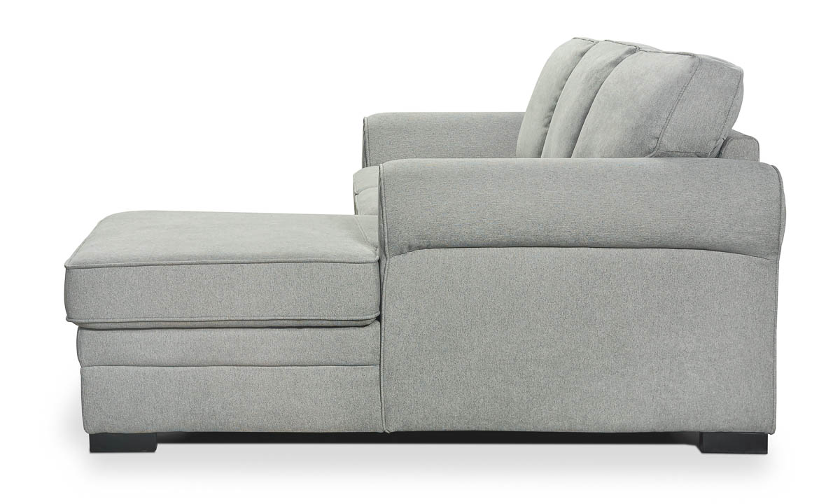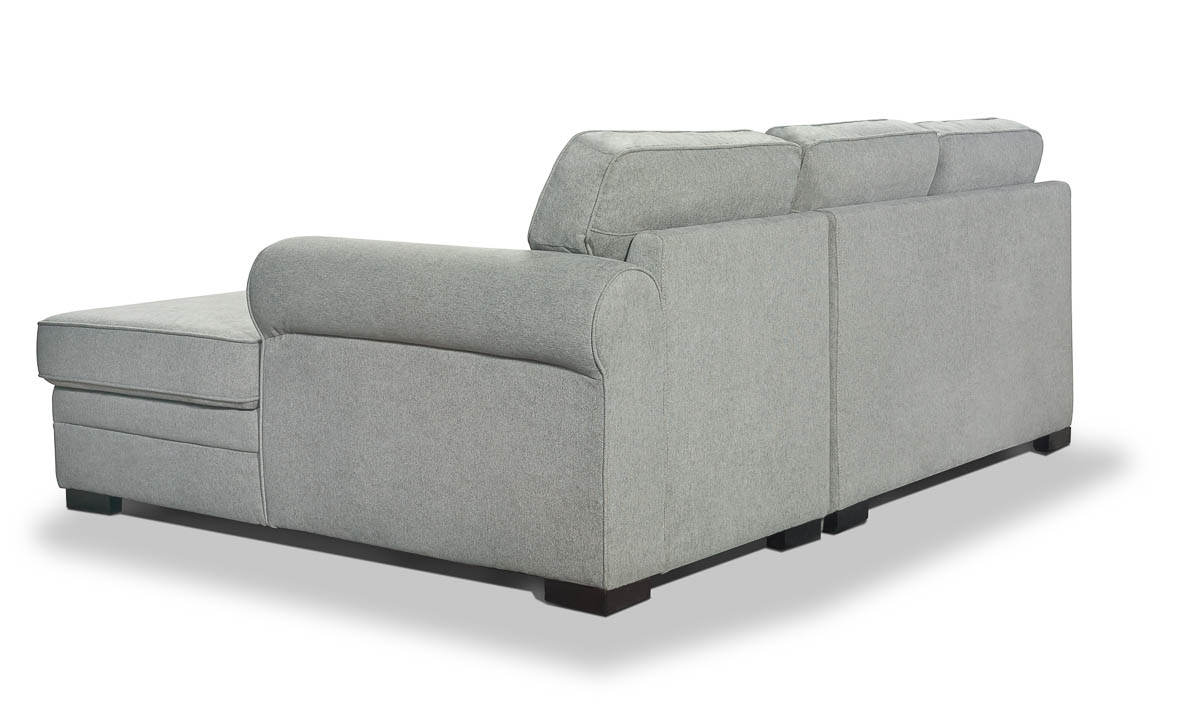 No matter what time of day or night, the Prospect Pebble 2-Piece Right Storage Chaise Sleeper Sectional will provide the comfort you crave. Resiliently crafted, this two-piece sectional starts with a solid Hardwood frame and heavy-duty webbing and sinuous spring support systems wrapped in high-density foam padding. Soft pebble Gray upholstery covers every inch of its welted roll arms and supportive plush cushions, creating a cozy place to curl up. A hidden handle on the loveseat helps this sectional transition into a sleeper with approximately 99” x 65” of space, perfect for a quick nap or impromptu overnight guests.Storage ottoman sold separately.