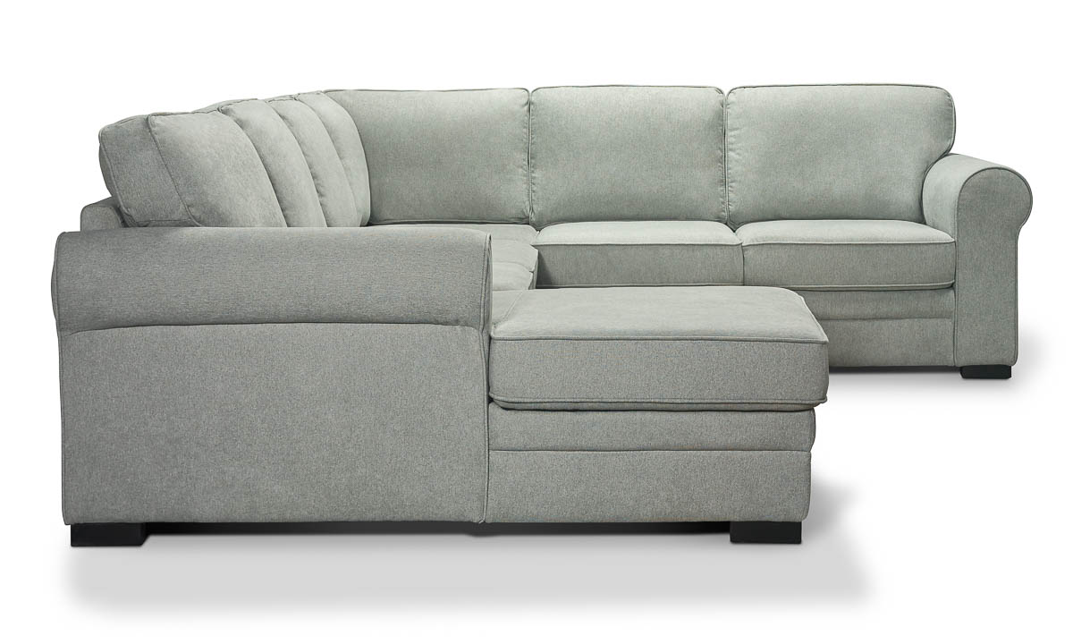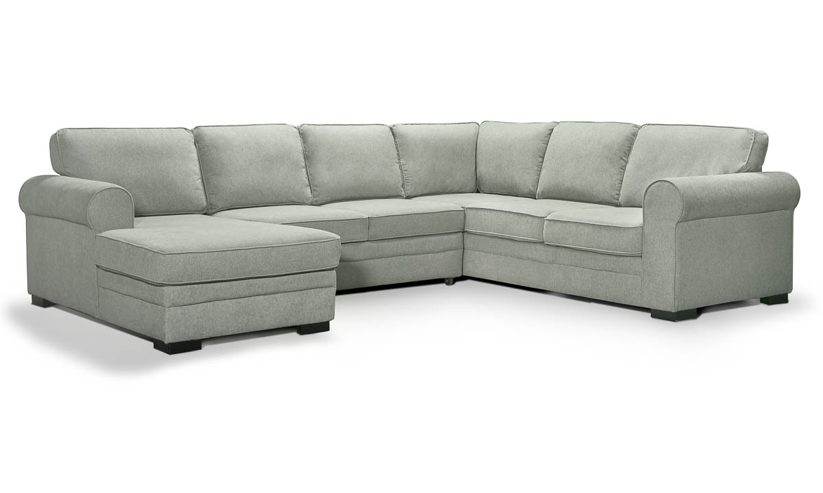 Curl up or stretch out for a nap on the Prospect Pebble 3-Piece Left Storage Chaise Sleeper Sectional. Durably crafted for long-lasting resiliency, this three-piece sectional starts with a solid Hardwood frame and heavy-duty webbed and sinuous spring support systems wrapped in high-density foam padding and cushions. A host of hidden amenities, like the pull-out cushions in the armless loveseat that extend into a comfortable sleeping space and the hidden, lift-up storage chamber within the chaise, make this an excellent choice for families. Versatile in both looks and functionality, the soft, pebble-Gray fabric upholstery, welted roll arms and loose back cushions create a clean, casual appeal that effortlessly compliments a range of decorative ensembles.